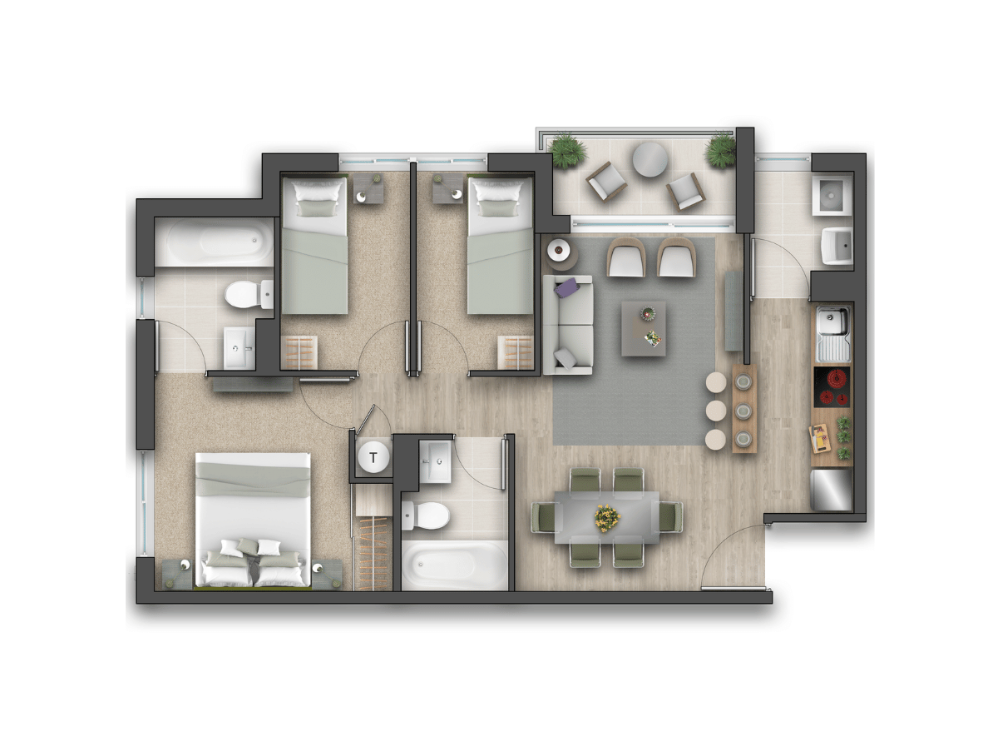 El Modelo Araucaria ofrece mayor espacio y privacidad, con 58,14 metros cuadrados que se distribuyen en 3 dormitorios y 2 baños, ideal para familias en crecimiento o quienes buscan más comodidad. Este departamento, 100% eléctrico, está diseñado para ofrecer una vida moderna y eficiente.