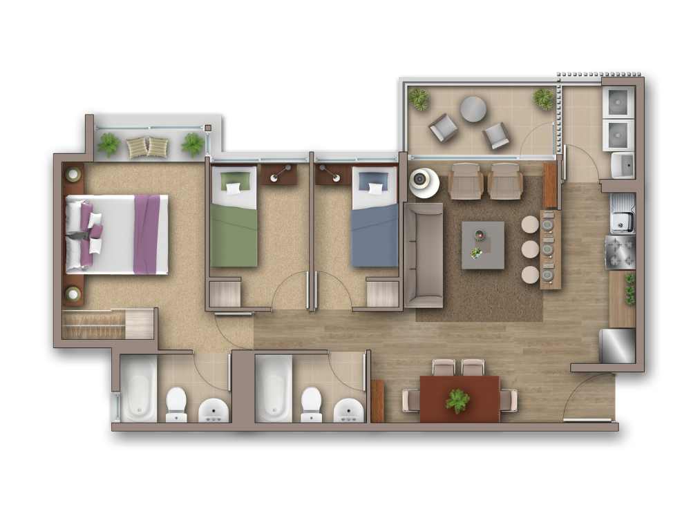 Los dormitorios cuentan con clósets conformados que maximizan el uso del espacio, mientras que los baños están perfectamente distribuidos para mayor privacidad y conveniencia. Este modelo también incluye estacionamiento.